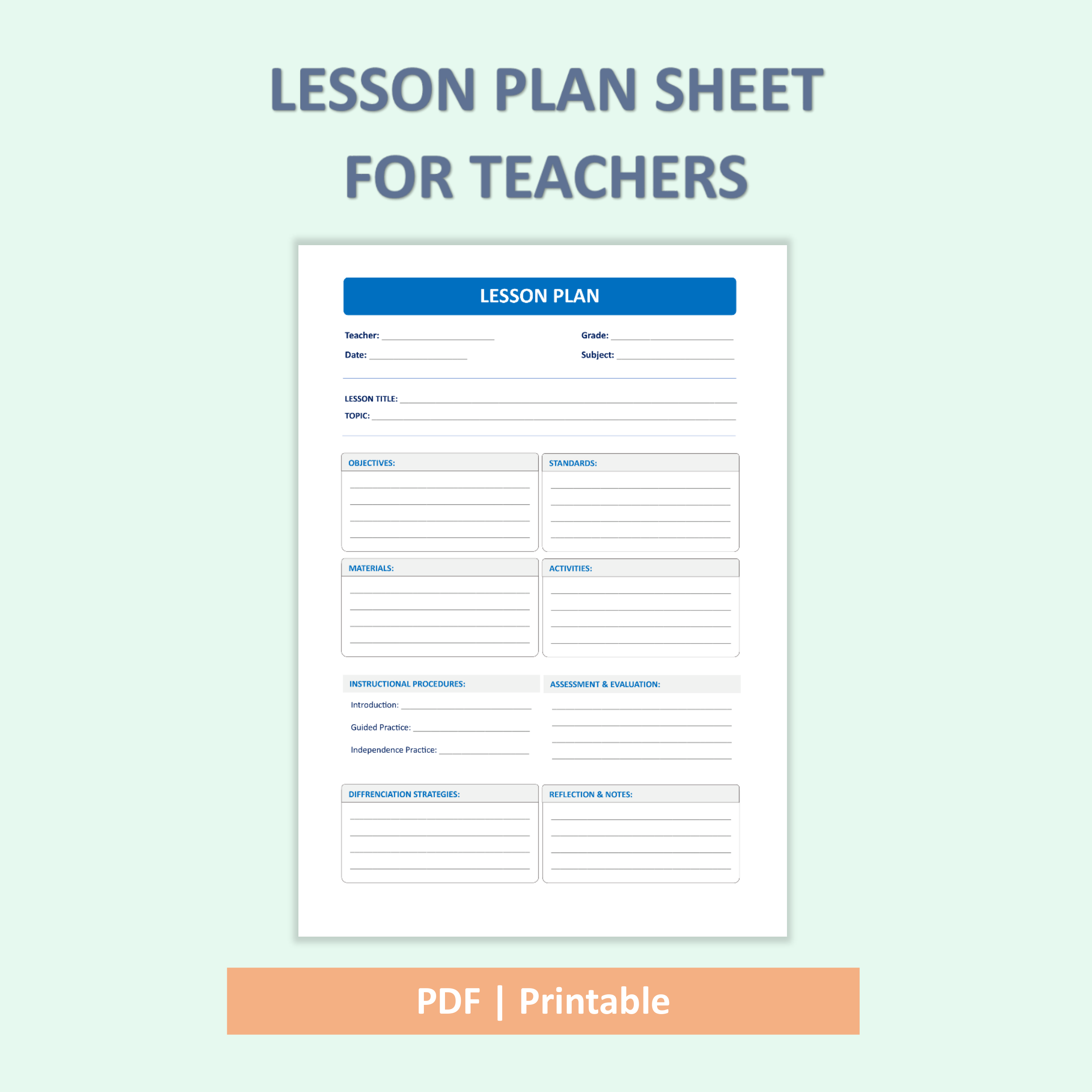 A ready-to-use, printable lesson plan sheet designed for teachers to organize daily or weekly lessons efficiently. Structured and professional, it allows educators to plan subjects, activities, objectives, and notes in a clean and organized format. Ideal for both classroom and online teaching.